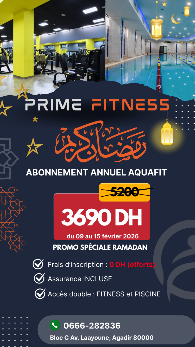 Promotion Ramadan explosive chez Prime Fitness Agadir ! Profitez d’une offre limitée sur l’abonnement annuel Aquafit à seulement 3690 DH (au...